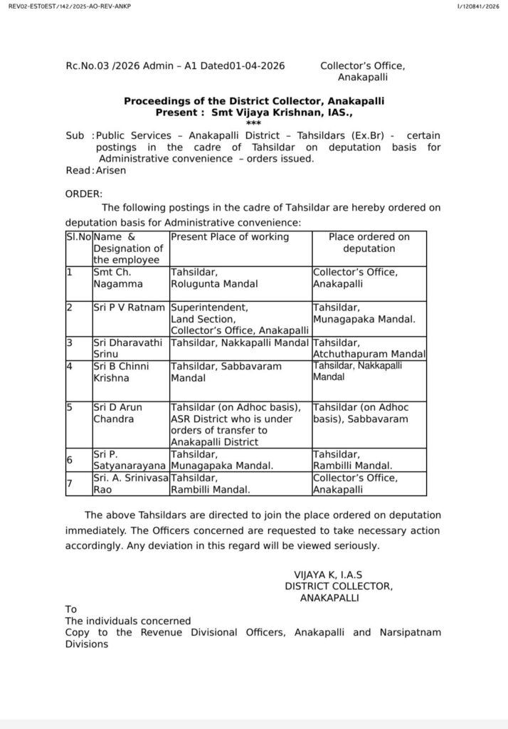 జిల్లాలోని ఏడుగురు తాసిల్దార్లను బదిలీ చేస్తూ అనకాపల్లి జిల్లా కలెక్టర్ విజయ కృష్ణన్ ఉత్తర్వులు జారీ చేశారు. పాలనా సౌలభ్యం నిమిత్తం వీరిని డిప్యూటేషన్ ప్రాతిపదికన బదిలీ చేస్తున్నట్లు ఆమె తన ఉత్తర్వుల్లో పేర్కొన్నారు.